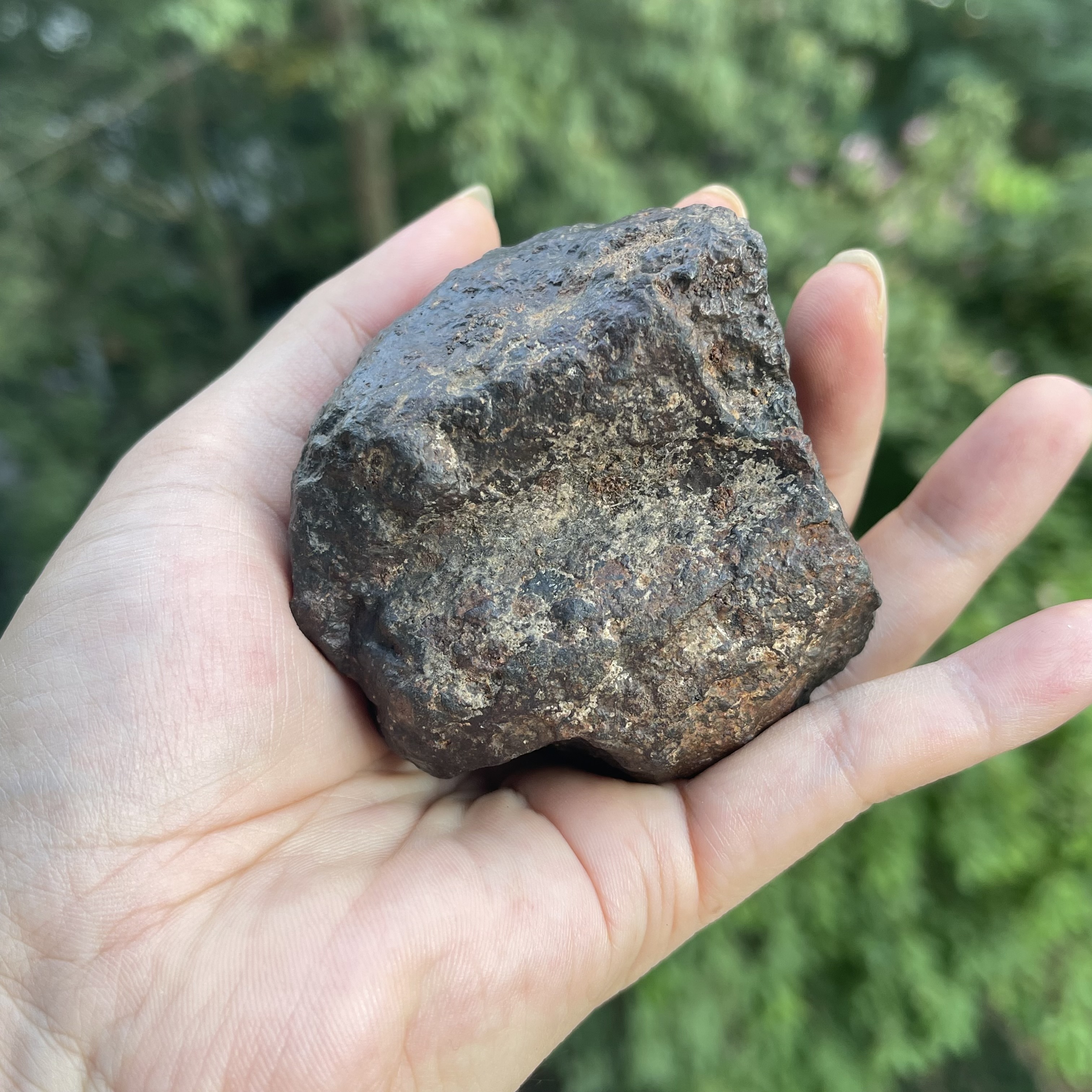 2021年发现于非洲阿尔及利亚的冲击熔融石陨石,风化面是漆黑熔壳,底部是着地面有一层锈迹,原始的味道,其重约422克。